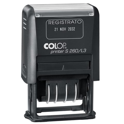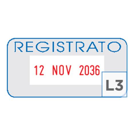 Descrizione / dati tecnici: Timbro datario con dicitura fissa REGISTRATO. Fusto antiurto in ABS. Caratteri con altezza da 4mm. Tampone ricambio nero E/200 (cod. 48014).