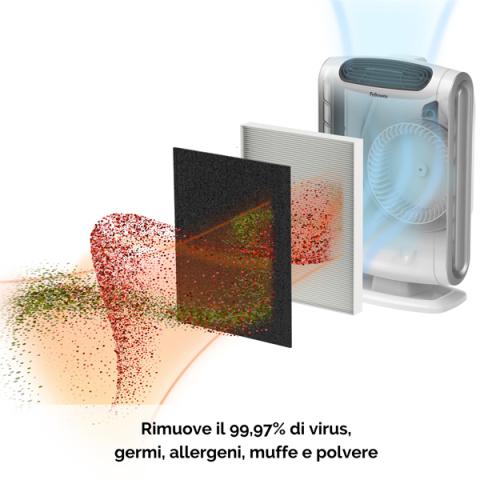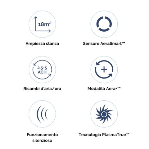 Descrizione / dati tecnici: Purificatore d’aria per ambienti fino a 20m2. Processo di purificazione dell’aria in 4 stadi che rimuove il 99,97% di tutti gli agenti inquinanti dell’aria fino alla dimensione di 0,3my: germi, virus, sostanze chimiche, odori, fumo, polveri sottili, pollini, allergeni. Due sistemi di filtraggio (filtro a carbone per rimuovere odori e sostanze chimiche; filtro HEPA VERO per particelle ed impurità) con trattamento antimicrobico AeraSafeTM per la riduzione della proliferazione di batteri sui filtri. Tecnologia PlasmaTrueTM che crea un campo ionizzato in grado di abbattere gli altri agenti inquinanti a livello molecolare. Modalità Aera+ aumenta la potenza del 35% per i periodi di maggiore incidenza delle allergie. Sensore AutoSmart: l’unità riconosce il livello di impurità dell’aria e regola la velocità della ventola. Pannello di controllo user friendly che avvisa quando è il momento di sostituire i filtri e mostra il livello di inquinamento dell’aria. Basso consumo energetico e grande silenziosità. CADR (velocità di purificazione d'aria): 129 (polvere), 126 (fumo), 124 (pollini). Filtro carbone ricambio (9324101): durata 3 mesi. Filtro Hepa ricambio (9287101) : durata 1 anno. Dimensioni: 45,4x29,4x14,4cm. Peso: 5,1kg.