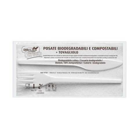 Descrizione / dati tecnici: Bis posate (coltello e forchetta) di colore avorio in Estabio compostabile e biodegradabile in conformità alla norma EN 13432. Per alimenti Max 70°C.