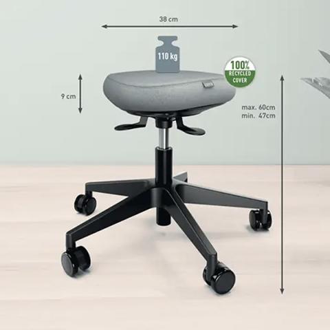 Descrizione / dati tecnici: Sgabello attivo con ruote dotato di seduta oscillante a 360°, La seduta e dotata di un’imbottitura Dual Density Foam (DDF) spessa 9 cm, con uno strato interno rigido per il supporto e uno strato esterno morbido per il comfort. Favorisce una postura corretta e riduce la pressione sulle gambe. Rivestimento 100% in materiale riciclato.