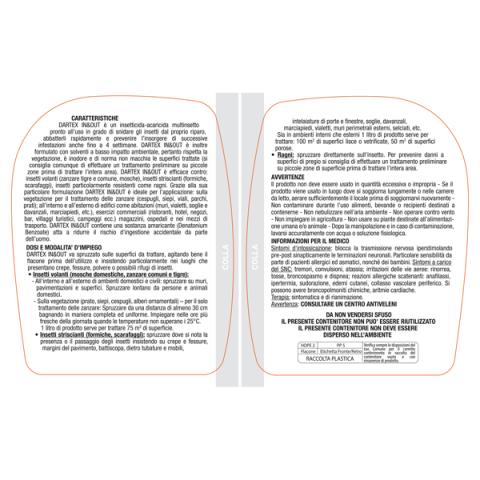 Descrizione / dati tecnici: Insetticida-acaricida multinsetto pronto all’uso in grado di snidare gli insetti dal proprio riparo, abbatterli rapidamente e prevenire l’insorgere di successive infestazioni anche fino a 4 settimane. Efficace contro insetti volanti (zanzare tigre e comune, mosche), insetti striscianti (formiche, scarafaggi), insetti particolarmente resistenti come ragni. Utilizzabile sulla vegetazione per il trattamento delle zanzare (cespugli, siepi, viali, parchi, prati); all’interno e all’esterno di edifici come abitazioni (muri, vialetti, soglie e davanzali, marciapiedi, etc). Modalità d’uso: agitare e spruzzare nella zona da trattare. Spruzzare nelle ore più fresche. Tecnologia con solventi a basso impatto ambientale - Vapo no gas. Composizione: Cipermetrina pura 0,25% – Denatonium Benzoate puro 0,001 %. Registrazione: DARTEX IN & OUT Presidio Medico Chirurgico – Registrazione del Ministero della Salute n. 20386 – DI LIBERA VENDITA. Può provocare reazione allergica. Molto tossico per gli organismi acquatici con effetti di lunga durata.