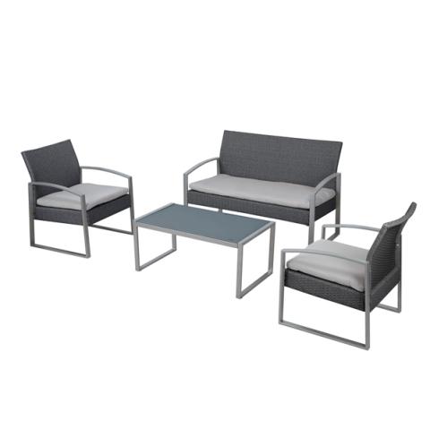 Descrizione / dati tecnici: Set composto da un tavolino, un divano e due poltrone. Struttura in acciaio verniciato con vernici epossidiche di colore grigio, rivestimento in polyrattan bianco lavato completo di cuscini di colore grigio. Tavolo rettangolare con top in vetro temperato spessore 5mm. Il set è consegnato smontato e contenuto in un unico cartone.Articolo destinato ad esclusivo uso domestico. Non adatto ad uso pubblico.Set composto da:1 tavolino H37 x P45 x L84cm 2 poltrone H75 x P65 x L59cm 1 divano H75 x P65 x L111cm