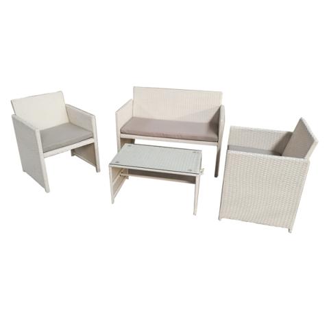 Descrizione / dati tecnici: Set composto da un tavolino, un divano e due poltrone. Struttura in acciaio verniciato con vernici epossidiche, rivestimento in polyrattan colore bianco completo di cuscini colore grigio chiaro. Tavolo rettangolare con top in vetro temperato spessore 5mm. Il set è consegnato smontato e contenuto in un unico cartone.Articolo destinato ad esclusivo uso domestico. Non adatto ad uso pubblico.Set composto da:1 tavolino H40 x P45 x L75cm 2 poltrone H77 x P60 x L58cm 1 divano H77 x P60 x L108cm