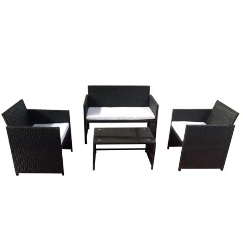 Descrizione / dati tecnici: Set composto da un tavolino, un divano e due poltrone. Struttura in acciaio verniciato con vernici epossidiche, rivestimento in polyrattan colore nero completo di cuscini colore bianco. Tavolo rettangolare con top in vetro temperato spessore 5mm. Il set è consegnato smontato e contenuto in un unico cartone.Articolo destinato ad esclusivo uso domestico. Non adatto ad uso pubblico.Set composto da:1 tavolino H40 x P45 x L75cm 2 poltrone H77 x P60 L58cm 1 divano H77 x P60 x L108cm