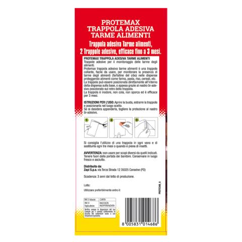Descrizione / dati tecnici: Blister contenente due Trappole adesive con attrattivo, protegge gli alimenti nelle dispense dall’attacco delle Tarme o Tignole delle derrate. Non cola, non sporca, non contiene insetticidi, la durata della trappola è di circa 3 mesi cadauna