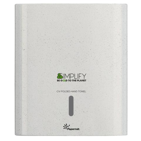 Descrizione / dati tecnici: Dispenser Simplify per asciugamani piegati a C/V (cod. 421337) realizzato per il 75% da materiale plastico post-consumo e materiali in eccesso proveniente dalla lavorazione del legno, al fine di garantire una riduzione degli sprechi nel rispetto dell'ambiente. Dispenser interamente riciclabili. Design pulito ed elegante, realizzato con materiali antiurto per maggiore praticità.