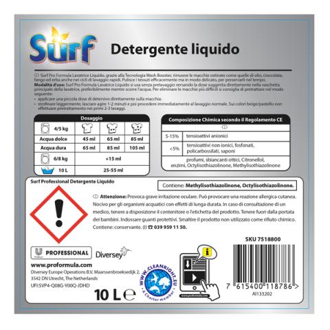 Descrizione / dati tecnici: Surf liquido lavatrice detersivo professionale in tanica da 10 litri. Garantisce eccellenti risultati in ogni condizione di durezza dell'acqua. Rimuove le macchie pi¨ difficili anche a basse temperature, rispettando tessuti e colori. Nuova formula concentrata con dosaggio medio di 75ml (133 lavaggi totali).