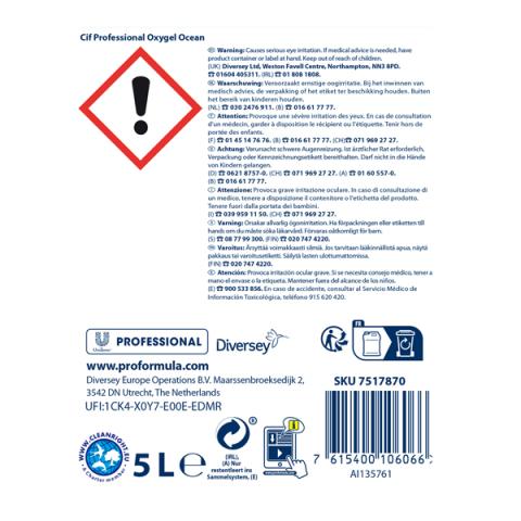 Descrizione / dati tecnici: Gel con ossigeno attivo per i paviementi e tutte le superfici lavabili. Cif Oxy-Gel Professionale sviluppa microbollicine che aiutano a sollevare lo sporco mentre il gel lo rimuove velocemente e a fondo. Non necessita di risciacquo. Gradevole profumazione. Modalità d’uso: Uso diluito: per pulire i pavimenti e le grandi superfici, versare 20 ml di Cif Oxy-Gel Professionale per ogni litro d’acqua. Il gel si dissolve immediatamente nell’acqua. Non occorre risciacquare. Dosaggi consigliati: 80-160 ml di prodotto in 8 litri d’acqua a seconda del grado di sporco. Uso puro: per lo sporco difficile di bagno e cucina, versare Cif Oxy-Gel Professionale direttamente sulla superficie, lasciare agire per qualche istante e risciacquare con un panno umido.