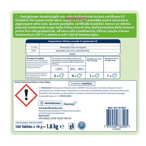 Descrizione / dati tecnici: Detergente per lavastoviglie in pastiglie 3in1: Detergente, Sale e Brillantante in un’unica pastiglia. Rimuove in modo efficace grasso, residui alimentari secchi e macchie di the e caffè. Utilizzabile in TUTTE le lavastoviglie, sia professionali che domestiche, a ciclo breve e a ciclo lungo ed è attivo anche a basse temperature (55 °C). Pellicola Hydrofilm, non si scarta e non si entra in contatto con il prodotto chimico. 0% Fosfati, 0% Profumi