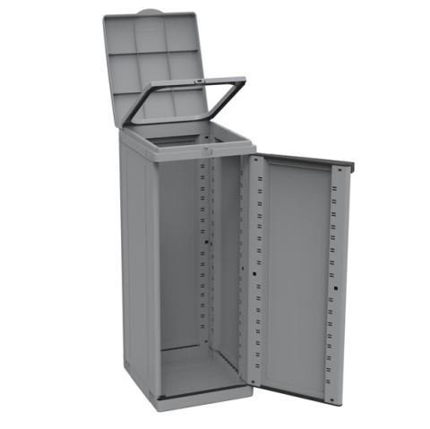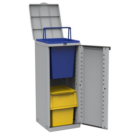Descrizione / dati tecnici: Armadietto ad 1 anta ideato per la raccolta differenziata dei rifiuti. Dotato di porta-sacco (da 110 L.) chiudibile con coperchio. L'apertura dell'anta permette una facile estrazione frontale del sacco pieno. Compatibile con contenitori Terry EcoBin 25Lt e 30 Lt. Da montare.