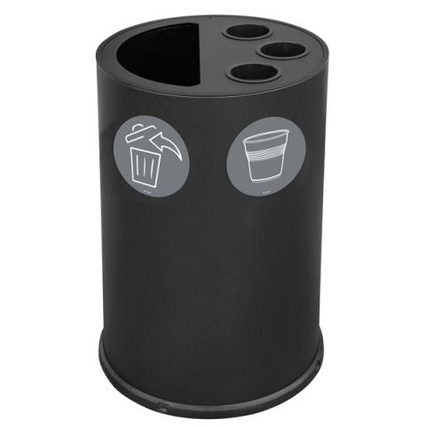 Descrizione / dati tecnici: Contenitore per raccolta bicchieri,palette e rifiuti da interno, cover a tre fori con tubi rigidi Ø int 92 mm per impilaggio bicchieri da 200 a 500 cc e uno scomparto (50Lt) per raccolta rifiuti separatamente dai bicchieri. Pratico tondino reggisacco ad incastro in acciaio zincato e svuotamento dall'alto. Il fusto con il relativo fondo e la cover forata sono realizzati in acciaio e rifiniti con verniciatura termoindurente. L'anello superiore, i tubi e il bordo salva-pavimento sono realizzati in materiale plastico. 2 pittogrammi magnetici inclusi. Dimensioni: Ø 45xh. 72cm.