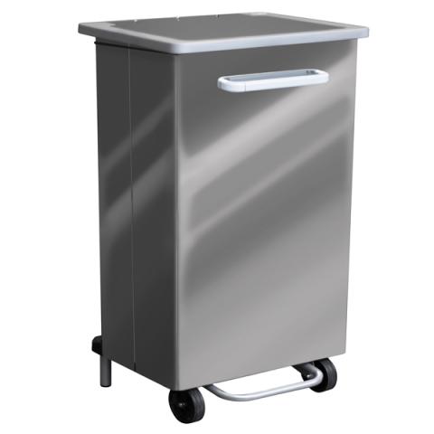Descrizione / dati tecnici: Contenitore a pedale per raccolta rifiuti totalmente in acciaio con svuotamento frontale. Fornito montato. Dimensione: 47x37xH83cm - 90L. Haccp.