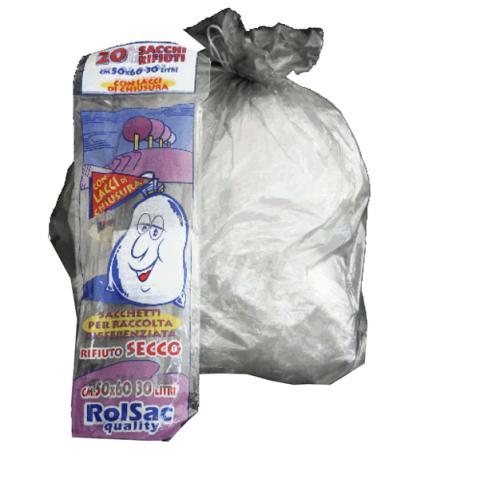 Descrizione / dati tecnici: Sacchi pattumiera di colore grigio trasparente in MDPE rigenerato + PLT lineare. Formato 50x60cm 30Lt 16µ con lacci di chiusura. In rotolo da 20 sacchi. Prodotto con alta resistenza meccanica. Adatti per la raccolta differenziata.