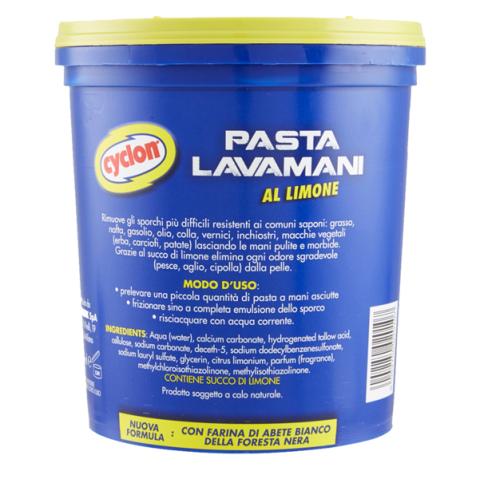 Descrizione / dati tecnici: Cyclon pasta lavamani al limone per rimuovere energicamente dalle mani lo sporco più difficile e resistente (grasso di motori, olio, nafta, ecc).