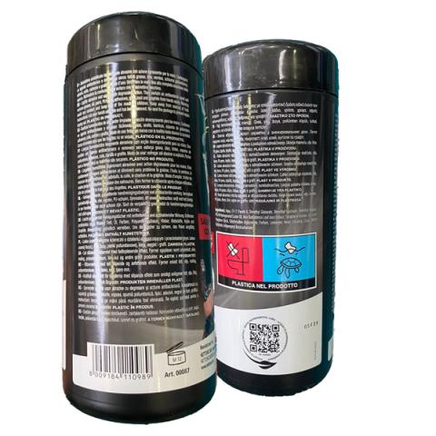Descrizione / dati tecnici: Salviette umidificate senza risciacquo, ideali da tenere a portata di mano nella cassetta degli attrezzi. Contiene solventi naturali e lanolina. Azione battericida. Particolarmente efficaci nell'eliminare vernici, smalto, sigillanti, catrame, ruggine, colle, resine, grasso, olio, lubrificanti, idrocarburi, bitume, nero di carbone, grafite, inchiostri, coloranti. Efficacia potenziata dall’aggiunta di solventi di origine naturale. Elimina i cattivi odori, lasciando le mani delicatamente profumate. Pratico: si può usare in qualunque situazione, non necessita risciacquo. Dimensione salviette: 17x20cm