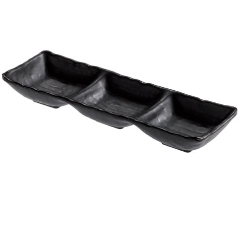Descrizione / dati tecnici: Vassoio a 3 scomparti in melamina nera, 27x9x3,5 cm. Peso netto 210gr. Capacità: 90ml +90ml+90ml Colore Nero. 100% Melamina, prodotto idoneo al contatto con tutti i tipi di alimenti (T max70°C). Articolo lavabile in lavastoviglie; Da non utilizzare con utensili taglienti. Prodotto da non utilizzare unitamente all'alimento nel forno tradizionale e forno a microonde; Conservare il prodotto in luogo asciutto,lontano dai raggi del sole e fonti di calore(0°C+35°C).
