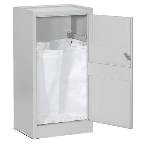 Descrizione / dati tecnici: Armadietto portabiancheria in lamiera di acciaio pressopiegata a freddo spessore mm. 7/10. Colore grigio RAL7038. Il mobile E' idoneo per lo smaltimento e il recupero di indumenti, panni e biancheria in genere. Vano interno dotato di 4 ganci in acciaio per il fissaggio del sacco di contenimento. Anta frontale con serratura a linguetta e frontalino basculante