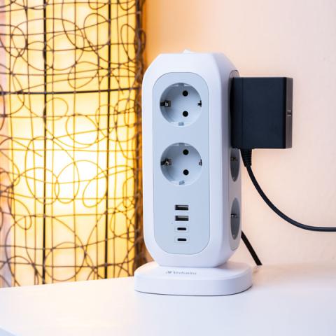 La Torre di alimentazione Multi-spina di Verbatim offre 11 prese CA, due porte USB-C e due porte USB-A.