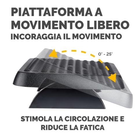 Descrizione / dati tecnici: Poggiapiedi Standard con piattaforma basculante e superficie massaggiante antistress. Altezza regolabile in due posizioni. Dimensioni piattaforma 33,3x44,7cm.