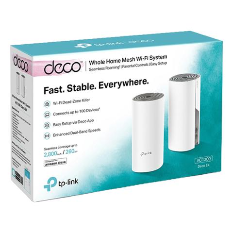 Descrizione / dati tecnici: Sistema Mesh Wi-Fi AC1200 Mesh Wi-Fi - Innovativa soluzione wireless con massimi livelli di affidabilità: distribuisce una connessione Wi-Fi veloce, stabile e senza interruzioni fino a 1167Mbps. Seamless Roaming - I dispositivi connessi passano da un Deco all'altro senza perdite di segnale. Copertura scalabile - Per ottenere maggiore copertura basta aggiungere una nuova unità al proprio kit. Deco E4 è inoltre compatibile con gli altri modelli Deco per la creazione di Network complessi. Parental control - Settaggi avanzati per la massima sicurezza dei tuoi bambini. QoS - Attribuzione della giusta priorità ad ogni applicazione, per mantenere la fluidità anche in caso di congestione o rallentamento della connessione Internet. Comandi vocali - Compatibile con Amazon Alexa. App Deco - Configurazione e gestione tramite app di nuova concezione.