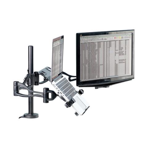 Descrizione / dati tecnici: Piattaforma laptop in acciaio e ABS, inclinazione completamente regolabile. Le staffe regolabili permettono di alloggiare un laptop di spessore tra 14 a 29mm e larghezza tra 25,8 e 37,5 cm. La piattaforma deve essere montata sul Braccio monitor singolo cod. 77590 o doppio cod. 77591 con apposito connettore. Maniglia ergonomica per spostare agevolmente la piattaforma. Dimensioni: 8,5 x 33 x 32cm. Peso: 2.3kg.