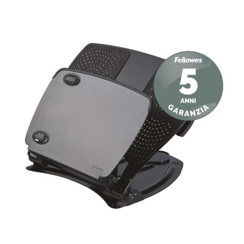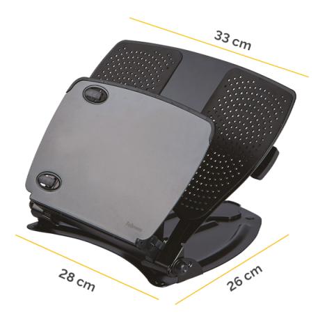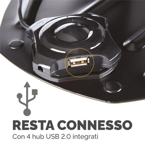 Descrizione / dati tecnici: Supporto per laptop in plastica antiurto e metallo con utilizzo di tastiera esterna. Regolabile in 11 livelli di altezza tra 85 e 245mm. Si ripiega completamente piatto quando non è in uso. Dotato di hub USB 2.0 con 4 porte, leggio e fessure per favorire la dispersione del calore emanato dal laptop. Comodo leggio frontale. Dimensioni: 30 x 28 x 3,5 (chiuso). Peso 2.27kg.