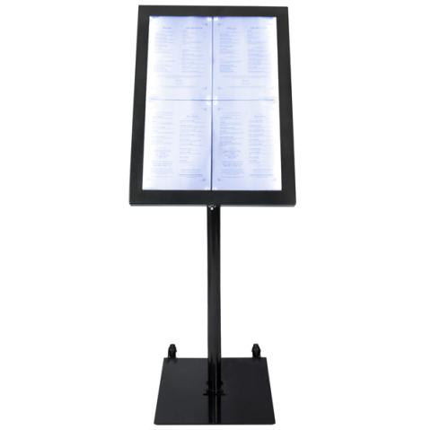 Descrizione / dati tecnici: Espositore in acciaio inox verniciato colore nero. Dotato di base e bacheca display con vetro di sicurezza, posizionabile sia in orizzontale che verticale. Resistente agli agenti atmosferici, chiusura con serratura. Illuminata internamente da luci a LED bianche. Telecomando, piantana (asse + base), spina di alimentazione e cavo da 5 metri inclusi. Compatibile con la batteria Securit® (non inclusa). Pannello metallico e magneti all’ interno. Le ruote per gli spostamenti sono acquistabili separatamente. Altezza 138cm. Formato contenuto: 4xA4.