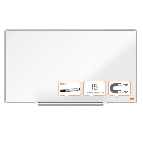 Descrizione / dati tecnici: Il formato widescreen offre una superficie di scrittura più accessibile ed estesa rispetto alle lavagne bianche tradizionali, in cui lo spazio in alto e in basso solitamente non vengono utilizzati. Dotata di una cornice contemporanea, sottile (6mm) e discreta che massimizza lo spazio di scrittura sulla lavagna. Il sistema InvisaMount™ semplifica l'installazione e i punti di fissaggio sono ben nascosti dietro la lavagna. La superficie magnetica in acciaio offre una buona cancellabilità per un uso moderato. L'ampio portapennarelli è fissato al bordo inferiore della lavagna in modo da non portare via spazio alla superficie. Pennarello Nobo cancellabile a secco in dotazione. Garanzia di 15 anni.