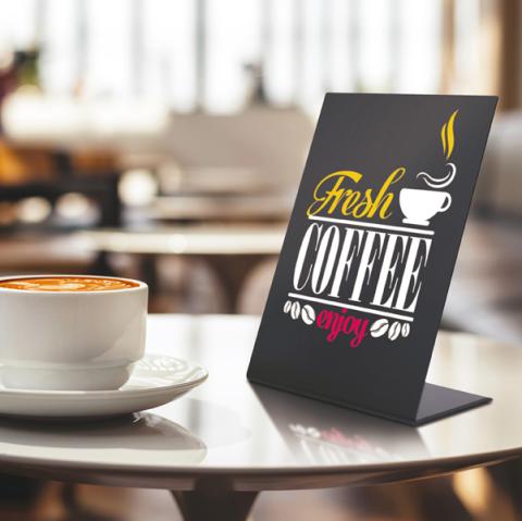 Descrizione / dati tecnici: Lavagne in acrilico nero a forma di L. Resistenti e facili da pulire. Rifinitura della lavagna frontale satinata e retro lucido. Resistente ai raggi UV e agli agenti atmosferici.