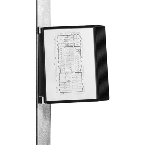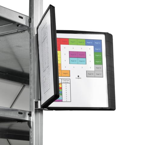 Descrizione / dati tecnici: Leggio robusto e performante dotato di dorso con magnete per essere appeso a qualunque superficie metallica senza doverla forare. Ideale per industrie, magazzini ed ambienti in cui è necessario un rapido accesso ad informazioni importanti vicino o sopra macchinari. I pannelli in polipropilene sono semplici da rimuovere e riposizionare ed i documenti contenuti saranno sempre protetti e a portata di mano. Il set è composto da un supporto da parete magnetico e da 10 pannelli espositivi SHERPA® formato A4 colore nero.