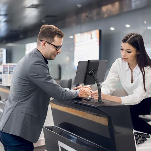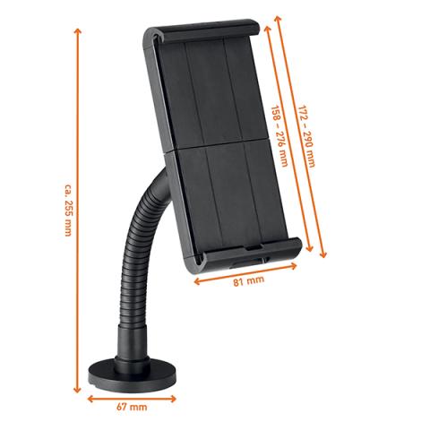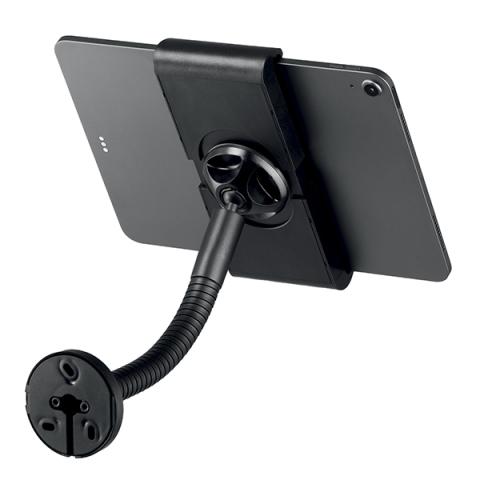 Descrizione / dati tecnici: Supporto con fissaggio da parete e da tavolo, realizzato in materiale ignifugo (conforme alla normativa DIN EN 45545-2) e dotato di braccio snodabile e giunto sferico. Compatibile con tablet da 7-13 pollici. Sistema antitaccheggio grazie al bloccaggio delle staffe con chiave speciale e protezione integrata contro la rimozione laterale del tablet. Particolarmente ergonomico grazie al braccio snodabile che permette la regolazione individuale dell'altezza. Fessura passacavo nella parte inferiore per il passaggio del cavo di ricarica. Ruotabile di 360° con angolo visivo regolabile. Apertura simmetrica delle staffe. Il rivestimento in gomma protegge il dispositivo dai danni accidentali. Utilizzo universale: ad es. in uffici, edifici pubblici, punti vendita e showroom, da casa in home office e in cucina, ecc.