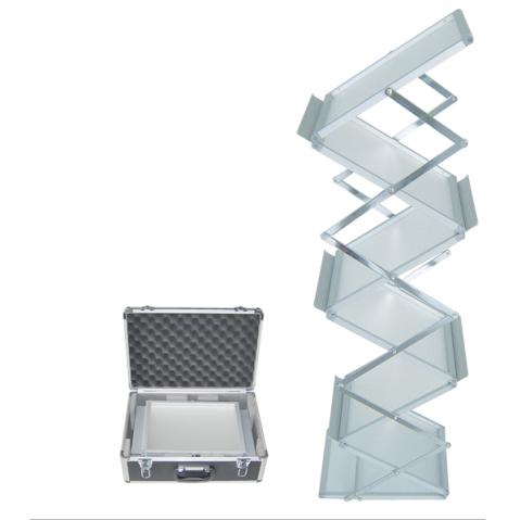 Descrizione / dati tecnici: Espositore ideale per essere trasportato, poichÚ ripiegabile. realizzato in alluminio anodizzato con 5 ripiani in plexiglass satinato formato a4. Dotato di fermo di sicurezza al piede per garantire stabilitÓ all'espositore quando aperto. La struttura ripiegata Þ contenuta in un'elegante valigetta. 31x28x135cm - 5 ripiani a4