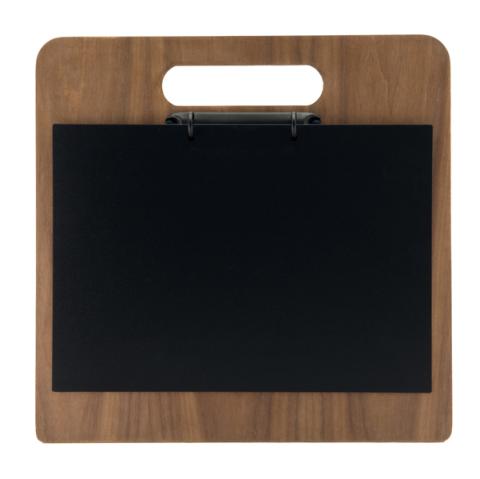 Descrizione / dati tecnici: Porta menù in legno a tagliere con 2 anelli in metallo laccato nero. Completo con lavagnetta sottile nera scrivibile e utilizzabile come copertina del menù. Pennarello incluso. Dimensioni: 32,7x30x2,6cm.