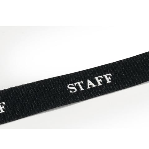 Descrizione / dati tecnici: Cordoncino in tessuto con stampa bianca STAFF con sgancio di sicurezza antisoffocamento e moschettone portabadge. Lunghezza 44cm, larghezza 2cm.