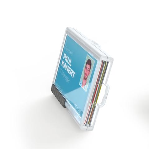 Descrizione / dati tecnici: Elegante portabadge con comparti separati per contenere e proteggere fino a 2 tessere formato 54x87mm. Utilizzabile sia in posizione orizzontale sia verticale. Perfetto per proteggere tessere con chip RFID e con banda magnetica. Levette scorrevoli per una facile espulsione delle tessere. In plastica trasparente crystal-clear di alta qualità.