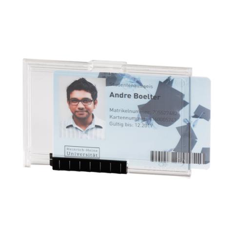 Descrizione / dati tecnici: Elegante portabadge con comparti separati per contenere e proteggere 1 tessera formato 54x87mm. Utilizzabile sia in posizione orizzontale sia verticale. Perfetto per proteggere tessere con chip RFID e con banda magnetica. Levette scorrevoli per una facile espulsione delle tessere. In plastica trasparente crystal-clear di alta qualità.