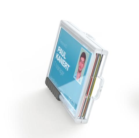 Descrizione / dati tecnici: Elegante portabadge con comparti separati per contenere e proteggere fino a 3 tessere formato 54x87mm. Utilizzabile sia in posizione orizzontale sia verticale. Perfetto per proteggere tessere con chip RFID e con banda magnetica. Levette scorrevoli per una facile espulsione delle tessere. In plastica trasparente crystal-clear di alta qualità.