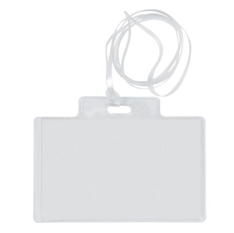Descrizione / dati tecnici: Porta nomi in PVC trasparente, alto spessore, completi di cordoncini in plastica e cartoncini. I cordoncini sono a norme di sicurezza anti soffocamento. Adatti a congressi, riunioni, visite guidate. Inserimento del cartoncino dal lato corto. Formato 95x60mm.