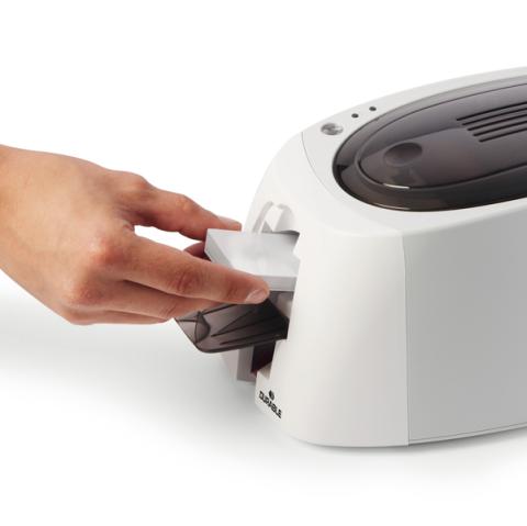Descrizione / dati tecnici: Stampante termica con risoluzione da 260x300 dpi adatta alla personalizzazione e stampa in modo semplice e veloce di tessere e badge su entrambi i lati. Le tessere stampate sono impermeabili e la stampa viene effettuata su tutta la superficie della tessera sia in bianco e nero che a colori. Facile e veloce il cambio dei carrelli tessere adatti a contenere fino a 40 tessere di basso spessore o 25 tessere di alto spessore. Facile creazione di tessere personalizzate grazie ai modelli a disposizione tramite il software online gratuito DURAPRINT® disponibile sul sito www.duraprint.it. La confezione include un kit composto dalla stampante, un nastro a colori YMCKO e 100 tessere neutre bianche pronte per la personalizzazione.Una volta stampate le tessere sono perfette per essere utilizzate in combinazione con i portabadge.