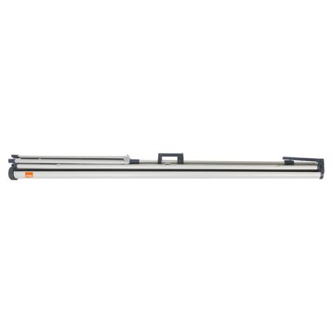 L' area di proiezione è riquadrata in nero per migliorare la visione ed affaticare meno la vista. superficie del telo bianco opaco. Retro in colore nero per evitare dispersioni luminose. Braccio superiore per angolare lo schermo.