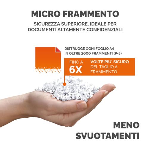 Descrizione / dati tecnici: Ideale per ambienti professionali con più di 10 utenti che hanno bisogno di distruggere notevoli quantità di carta. Distrugge fino a 14 fogli alla volta in modalità manuale, o 600 fogli in modalità automatica. Micro frammenti da 2x12mm (riduce ogni foglio A4 in più di 2000 pezzi). Grazie al ciclo di lavoro continuo è sempre pronto all’uso, e distrugge l’intera capacità (600 fogli) in circa 15 minuti. Il blocco intelligente protegge il vassoio di caricamento con un codice a 4 cifre, impedendone l’accesso ad altri fino al termine della distruzione. Distrugge carte di credito (tramite l’ingresso manuale), punti metallici e graffette. Cestino estraibile da 83 litri (900fogli) Velocità di taglio: 3 MPM manuale. Ciclo di lavoro continuo. Livello sicurezza Din P5. Dimensioni: 890x441x578mm. Peso 38,2Kg. GARANZIA: 2 anni sulla macchina, 7 anni sulle lame.