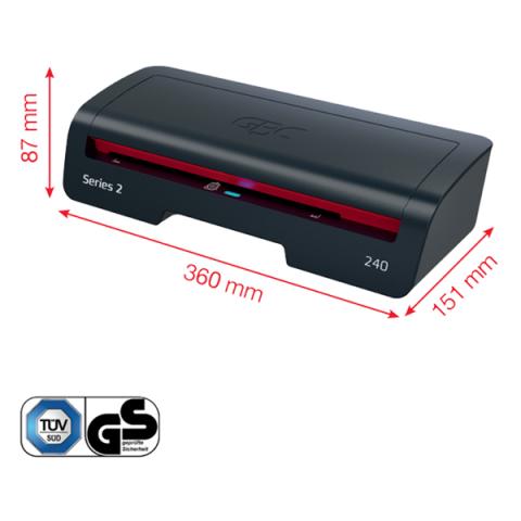 Descrizione / dati tecnici: GBC 240 è una soluzione elegante ed efficiente per le esigenze di plastificazione di tutti i giorni. Questa plastificatrice A4 è ideale per l'uso a casa o in ufficio. Con un tempo di riscaldamento di 2 minuti, plastifica un foglio A4 da 75 micron in soli 45 secondi, rendendolo perfetto per gestire in modo efficiente i tuoi progetti domestici. L'interruttore di controllo, facile da usare, offre tre impostazioni di spessore della pouches da 75 a 125 micron, garantendo flessibilità per vari tipi di documenti. Una leva di sblocco anti-inceppamento assicura un funzionamento regolare. Inoltre, il sistema intelligente di LED di stato semplifica il funzionamento con chiare indicazioni visive e acustiche: rosso durante il riscaldamento, blu con un suono quando è pronto e spegnimento automatico dopo 15 minuti di inattività per risparmiare energia. Colore nero e rosso. Tempo di riscaldamento rapido, pronto all'uso in soli 2 minuti. Compatibile con pouches da 75 a 125 micron. Plastifica da carte d'identità a documenti in formato A4. Plastifica un documento A4 (75 mic) in soli 45 secondi. Plastifica 13 x A4 in 10 minuti. LED di stato SMART: si illumina di rosso durante il riscaldamento e diventa blu con un segnale acustico quando la plastificatrice è pronta all'uso. Include una confezione iniziale di 5x pouches A4 (75 micron). Basso livello di rumore (> )>50Dba per ridurre le distrazioni. Certificato CE, TUV/GS.