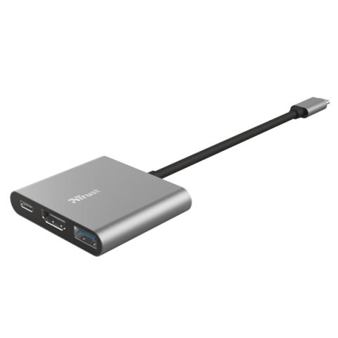 Descrizione / dati tecnici: Con l'adattatore multiporta Trust Dalyx 3-in-1 USB-C, è possibile ottenere il massimo dal laptop. E' possibile aumentare il numero di porte sul laptop e collegarsi a più dispositivi attraverso la porta HDMI, USB-A e USB-C per la ricarica. Versatile adattatore multiporta adatto per ogni laptop, MacBook e tablet dotato di porta USB-C. L'adattatore Dalyx consente di trasferire dati in modo estremamente rapido attraverso due porte USB-A alla velocità massima di 5 Gbps tramite USB 3.2 Gen1. Non occorre installare alcun software aggiuntivo, basta inserire la spina e partire! Con un'unica porta USB-C sul dispositivo, Dalyx offre una connettività versatile. Collegando il tablet o il laptop a un monitor o alla TV tramite la porta HDMI, è possibile vedere film e foto ad altissima risoluzione con colori nitidi grazie allo standard HDMI 1.4 (4k30Hz), ricaricare il laptop dalla porta USB-C con tecnologia PD (Power Delivery) e aggiungere altri dispositivi come la tastiera o un drive esterno tramite la porta USB-A. L'adattatore si presenta in una resistente struttura in lega di alluminio pressofuso, che rappresenta un complemento raffinato per arredare la scrivania e il kit di lavoro, ma è anche perfetto per i viaggi grazie al formato compatto.