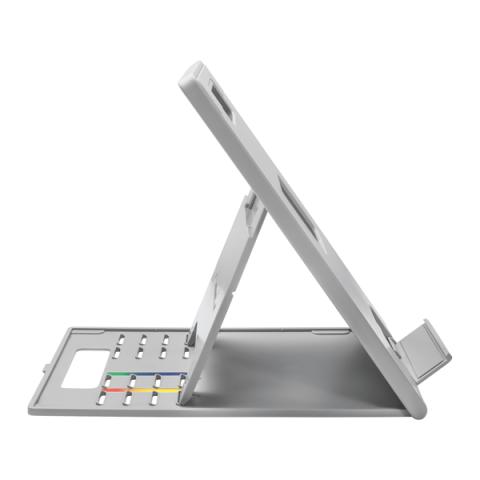 Descrizione / dati tecnici: La base di raffreddamento e rialzo regolabile ed ergonomico per laptop o tablet Kensington® SmartFit® Easy Riser™ Go unisce il vantaggio dal punto di vista ergonomico di portare più in alto lo schermo ai vantaggi tecnologici di una migliore circolazione dell'aria. L'elegante design 2 in 1 consente di regolare altezza e angolazione per migliorare la postura, favorire il corretto allineamento degli occhi e garantire la comodità di collo e spalle preservando al tempo stesso la temperatura dei componenti interni del laptop o del tablet. I piedini antiscivolo impediscono lo scorrimento in avanti della base, gli inserti imbottiti garantiscono una tenuta sicura del dispositivo e il design pieghevole e sottile la rende facilmente trasportabile. Da utilizzare con tastiera e mouse esterni (venduti separatamente). Supporta laptop e tablet fino a 14".Dimensioni: 286x194x24