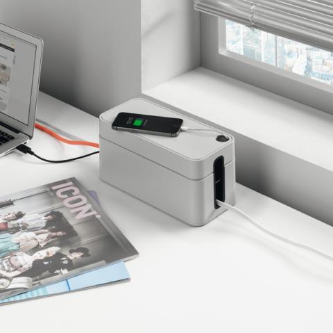 Descrizione / dati tecnici: Scatola per nascondere cavi e multi prese da 3 entrate, realizzata in plastica ignifuga di alta qualità. Studiata per una gestione ordinata dei cavi, è dotata di fessure laterali che ne consentono il passaggio, inoltre facilitano la circolazione ottimale dell’aria. Il coperchio ha un’apertura passacavi circolare richiudibile ideale per cavi di ricarica dei telefoni cellulari.