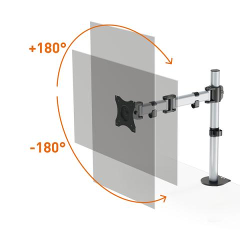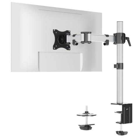 Descrizione / dati tecnici: Braccio porta monitor per 1 monitor standard fino a 27" e fino a 8 kg. Fissaggio tramite morsetto o perno per foro passacavo (entrambi inclusi nella confezione). Altezza, inclinazione e orientamento del monitor regolabili facilmente e individualmente per un lavoro ergonomico. Supporto universale VESA (75 x 75 mm o 100 x 100 mm). Gestione dei cavi: il cavo del monitor è guidato lungo il supporto da 3 clip passacavo, proteggendolo così dalla rottura. Il monitor può essere ruotato di 360° per lavorare in modalità verticale o orizzontale. I tre snodi presenti sul braccio lo estendibile fino a 40 cm e permettono di direzionare il monitor di 180° (+90°/-90°). Il monitor può essere inclinato di 90° (+45°/-45°)• L'altezza dello schermo puà essere regolata lungo la colonna da 44 cm. Fissaggio con morsetto: per scrivanie da 10-88 mmFissaggio con perno per foro passacavo: per scrivanie da 10-75 mm. Materiali: acciaio, plastica e alluminio.