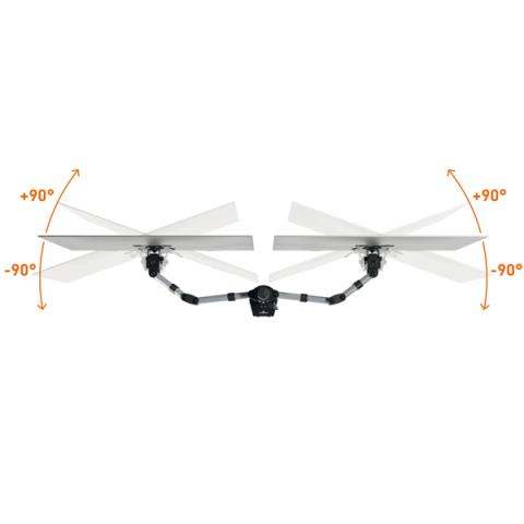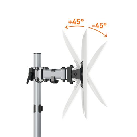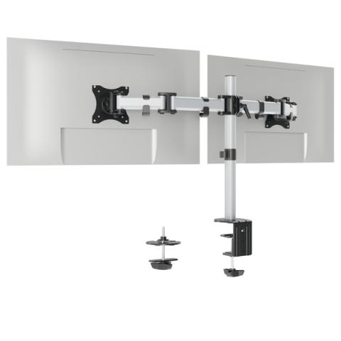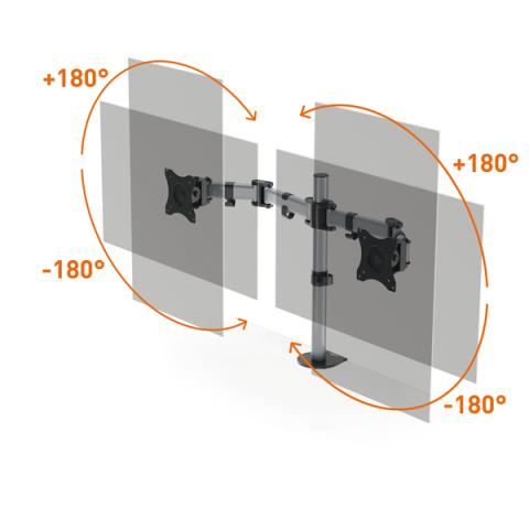 Descrizione / dati tecnici: Braccio porta monitor per 2 monitor standard fino a 27" e fino a 8 kg. Fissaggio tramite morsetto o perno per foro passacavo (entrambi inclusi nella confezione). Altezza, inclinazione e orientamento del monitor regolabili facilmente e individualmente per un lavoro ergonomico. Supporto universale VESA (75 x 75 mm o 100 x 100 mm). Gestione dei cavi: il cavo del monitor è guidato lungo il supporto da 3 clip passacavo, proteggendolo così dalla rottura. Il monitor può essere ruotato di 360° per lavorare in modalità verticale o orizzontale. I tre snodi presenti sul braccio lo estendibile fino a 40 cm e permettono di direzionare di 180° (+90°/-90°). Il monitor può essere inclinato di 90° (+45°/-45°). L'altezza dello schermo puà essere regolata lungo la colonna da 44 cm. Fissaggio con morsetto: per scrivanie da 10-88 mmFissaggio con perno per foro passacavo: per scrivanie da 10-75 mm. Materiali: acciaio, plastica e alluminio.