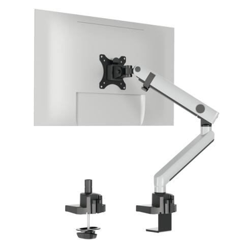 Descrizione / dati tecnici: Braccio porta monitor per 1 monitor standard fino a 32" e fino a 8 kg. Fissaggio tramite morsetto o perno per foro passacavo (entrambi inclusi nella confezione). Altezza, inclinazione e orientamento del monitor regolabili facilmente e individualmente per un lavoro ergonomico. Supporto universale VESA (75 x 75 mm o 100 x 100 mm). Facile installazione del monitor grazie al meccanismo ad innesto. Braccio dotato di molla meccanica che stabilizza il monitor. Gestione dei cavi: il cavo del monitor è guidato lungo il supporto da una canalina interna e una clip passacavo, proteggendolo così dalla rottura. Il monitor può essere ruotato di 90° per lavorare in modalità verticale o orizzontale (con meccanismo di bloccaggio). Monitor direzionabile di 180° (+90°/-90°). Il monitor può essere inclinato di 180° (+90°/-90°). Fissaggio con morsetto o perno per foro passacavo: per scrivanie da 10-50 mm. Materiali: alluminio, acciaio e plastica.