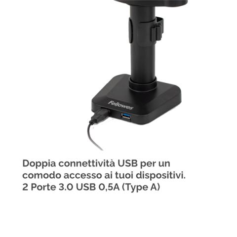 Descrizione / dati tecnici: Bracci monitor completamente regolabili con innovativa tecnologia a molle a gas per spostamenti e regolazioni senza sforzi del monitor. Il sistema ordinacavi tiene la scrivania in ordine, e la porta USB alla base permette di connettere fino a due dispositivi. Facile montaggio a morsa o tramite foro e ganascia. Varie configurazioni di schermi disponibili. Compatibilità VESA - 75x75/100x100. Per scrivanie di spessore compreso tra 19 e 120mm. Peso max monitor: 27kg. F.to max monitor: 30"/76,2cm. Rotazione: 360°. Inclinazione: +85/15°.