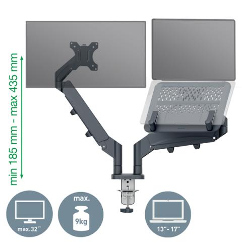 Descrizione / dati tecnici: Braccio ergonomico doppio per monitor e laptop certificato IGR (solo per il monitor) e TÜV, in grado di migliorare la postura, l'allineamento degli occhi e il comfort di collo e spalle quando l'altezza del monitor e del laptop sono regolati correttamente. Il design salvaspazio consente di montarlo in spazi ridotti, pur garantendo la massima profondità di campo e un'ergonomia visiva ott imale. Il monitor e il laptop possono essere regolati in modo completamente indipendente l'uno dall'altro. Doppi bracci a molla per regolare facilmente l'altezza del monitor (185mm-435mm) o del laptop. Facile regolazione dell'altezza, della profondità e dell'angolazione con una sola mano: +90°/-90° di rotazione a sinistra e a destra, fino a 180° di rotazione orizzontale e verticale del monitor, +55°/- 55° di inclinazione dello schermo. Design robusto e stabile per supportare monitor piatti o curvi da 17"-32" con un peso massimo di 9 kg (19,8 libbre) e laptop da 13-17" con uno spessore massimo di 2,4 cm. Facile da installare grazie alla piastra Vesa® staccabile a sgancio rapido inclusa (75 e 100 mm) e al morsetto a C in gomma siliconica che ridurrà le vibrazioni e proteggerà la superficie della scrivania o al foro per il gommino (spessore della scrivania: 10-80 mm). Attrezzi per il montaggio e la regolazione inclusi. Il sistema di gestione dei cavi consente di organizzare i cavi del monitor per uno spazio di lavoro più ordinato. Dimensione:1120 x 110 x 600 cm.Peso 6,5kg